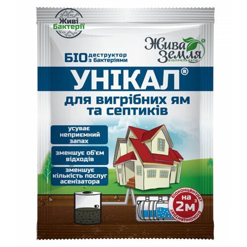 Біопрепарат Унікал-с являє собою порошок, розроблений на основі мікроорганізмів і ферментів, який використовується для очищення каналізаційних систем, туалетів, септиків, вигрібних ям. Діючою речовиною біопрепарату є висококонцентрована суміш живих бактерій та ферментів з висівками як наповнювач. Застосування Унікал-с призводить до нормалізації бактеріальної мікрофлори, поліпшення дренажу в септиках, усунення неприємних запахів та значного скорочення обсягу відходів при регулярному використанні. Продукт ефективно очищає каналізаційні системи від органічних відходів та відкладень на стінках труб. Коли біопрепарат потрапляє у каналізацію, мікроорганізми та ферменти активно працюють, утворюючи колонії на внутрішніх поверхнях труб. Робочі бактерії усувають відкладення та скупчення органічних відходів без заподіяння шкоди трубам. Розкладання та утилізація органічних відходів відбуваються через гідроліз макромолекул до розчинних сполук. Унікал-с успішно очищує як пластикові, так і металеві труби, сифони і колектори, усуває неприємні запахи та пригнічує ріст шкідливих мікроорганізмів. У разі використання біорозкладача для обробки вуличних туалетів засіб покращує дренаж, зменшує обсяг нечистот, усуває неприємні запахи та знижує витрати на виклик асенізаторської служби.