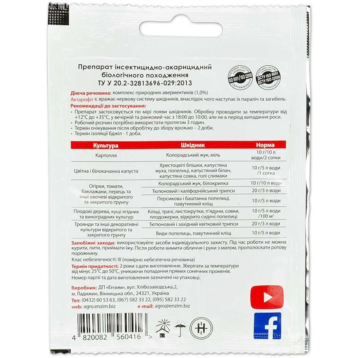 ◾ Призначення: Білокрилка, Колорадський жук, Кліщі, Листовійки, Молі, Плодожерки, Попелиця, Совка