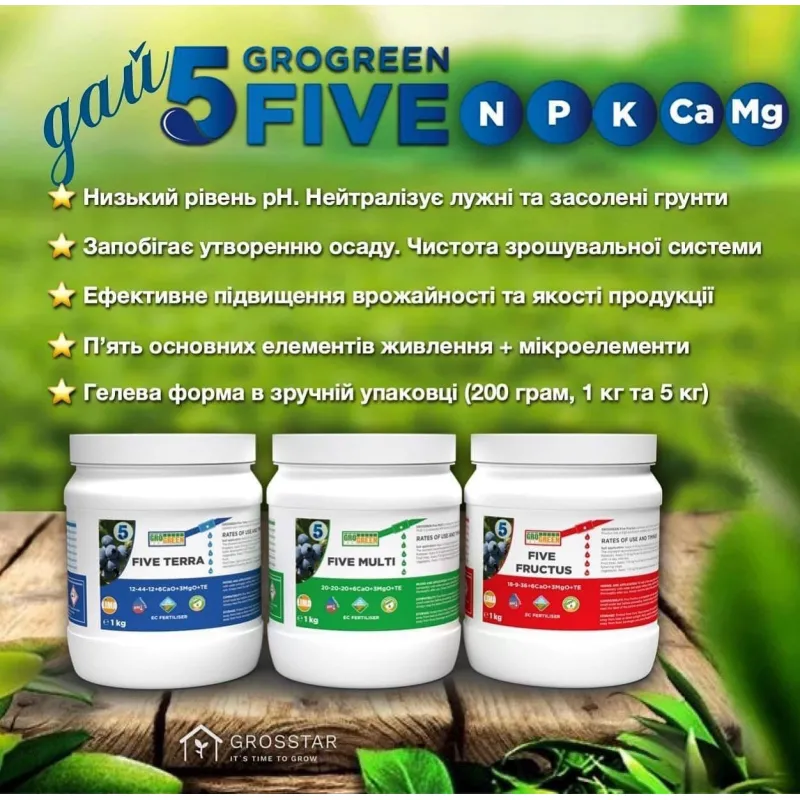 – Захист. Завдяки унікальному складу Grogreen Five Fructus 18 9 36 допомагає зменшити симптоми стресу та захищає рослини від несприятливих умов вирощування.