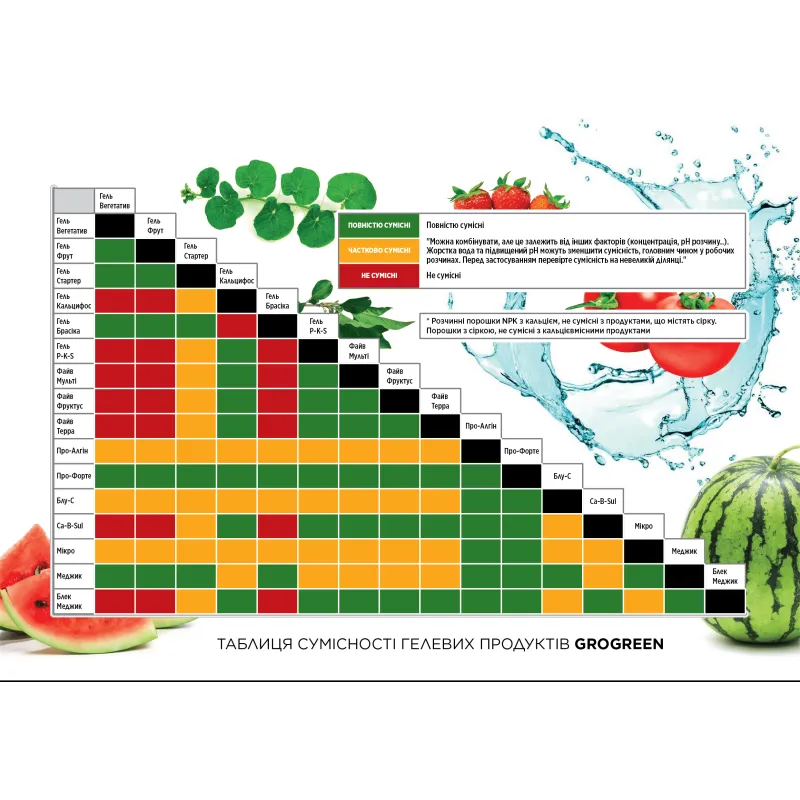 Грогрін Five MULTI змішується у резервуарі з водою, забезпечуючи рослину всім необхідним харчуванням. При необхідності гель-файв мульти можна змішати з нітратом кальцію в одному резервуарі. Не змішувати з іншими добривами NPK або добривами, що містять фосфати та/або сульфати.