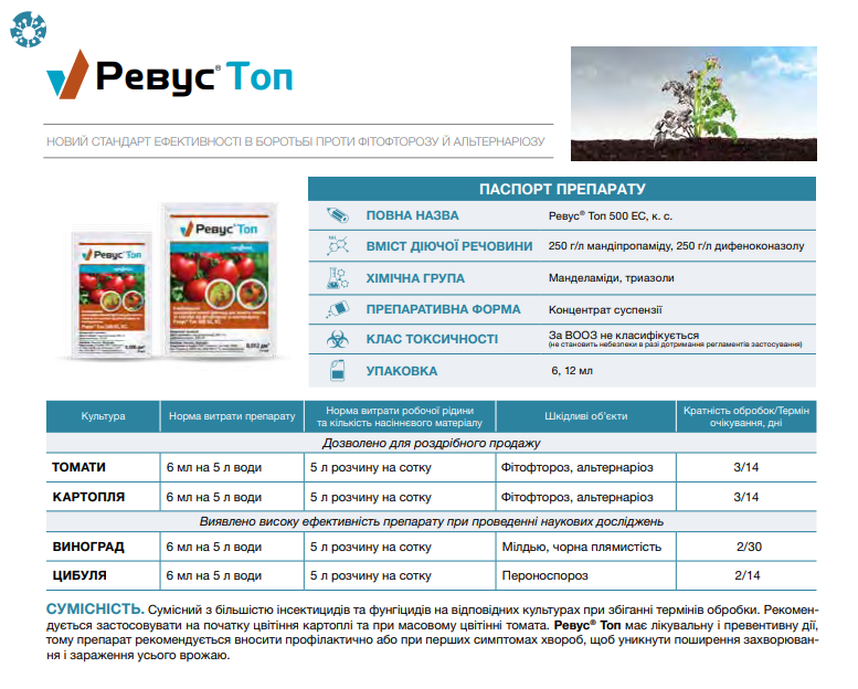 Крім дії на альтернаріоз і фітофтороз, Ревус Топ має сильну додаткова дію на ризоктоніоз, септоріоз й окремі інші хвороби. Застосовують Ревус Топ у кінці цвітіння і на початку бульбоутворення картоплі, та на початку зав’язування плодів у томатів після препарату Ридоміл Голд.