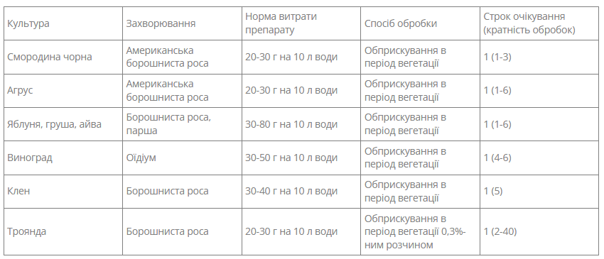 ◾ Призначення: від борошнистої роси, парші, антракнозу, оїдіуму, фітофторозу та інших поширених