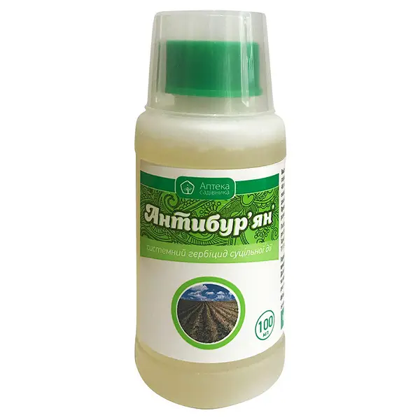 Гербіцид суцільної дії Антибур’ян має універсальну дію і призначений для застосування на парах, несільськогосподарських землях та польових ділянках після збирання попереднього врожаю. Він діє на безліч видів бур’янів і відноситься до системних гербіцидів. Основним активним компонентом є гліфосат, який вбирається через листя при контакті з рослинами та поширюється по всьому організму. Блокування синтезу амінокислот призводить до загибелі рослин. Залишки гербіциду можуть бути змиті дощем у грунт, проте коріння рослин гліфосат не абсорбує. Друга активна речовина, дикамба, є гербіцидом листової та грунтової дії, що пригнічує бур’яни, стійкі до МЦПА та 2,4-Д. Воно використовується у боротьбі з багаторічними коренепаростковими бур’янами. Комбінація двох активних компонентів призводить до прояву дії гербіциду Антибур’ян на однорічних рослинах через 2-4 дні після обробки, але в багаторічних – через 7-10 днів і більше, залежно від стадії розвитку. Хмарна або холодна погода може сповільнити дію препарату. Однорічні бур’яни пригнічуються протягом 20-60 днів до повторного зростання. Після обробки гербіцидом бур’яни висихають та гинуть. Гербіцидний засіб успішно застосовується на виноградниках, землях до посіву або висадки культур, землях після збирання врожаю та пари, землях несільськогосподарського призначення, насадженнях плодових та лісових культур у боротьбі проти злакових та дводольних бур’янів: пирію повзучого, грястиці збірної, мишію сизого, мишію зеленого, вівсюга звичайного, стоколоса безостого, плоскухи звичайної, гумаю (сорго алепського), в’юнка польового, осота рожевого, петрушки собачої, амброзії полинолистої, споришу, лободи білої, щириці (види), талабана польового, гірчиці польової, зірочника середнього, василька синього, портулака огороднього, галінсоги дрібноцвітої, ромашки (види) та інших видів.