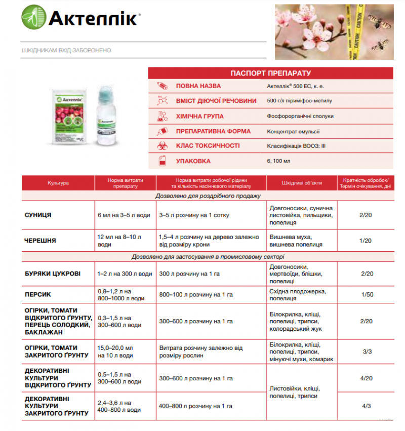Інсекто-акарицид Актеллік – це дієвий несистемний фосфорорганічний препарат, який здійснює контактну, кишкову і акарацидну дію. Його застосовують для знищення листогризучих і сисних шкідників та кліщів.
