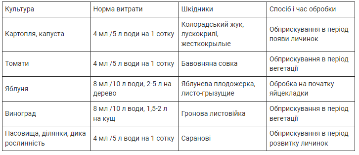 ◾ Високоякісний інсектицид, застосовується для знищення широкого спектру комах на різних сільськогосподарських культурах овочевої та плодово-ягідного типу, таких як: виноградники, капуста, різнотрав’я, томати, яблуня.