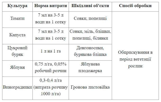 Капуста: совки, міль, білянки, блішки, попелиці — 7 мл на 3-5 л води на 1 сотку.