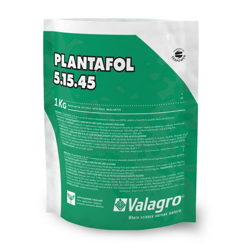 Plantafol 5-15-45, 25 г – мінеральне добриво на фазі дозрівання плодово-ягідних, овочевих і польових культур. Високий вміст калію у складі (45%) покращує структуру клітин, зміцнює лист. Підживлення даним комплексом збільшує кількість цукру в буряках, олії ріпаку та соняшника, покращує зберігання продукції, її якісні показники.
