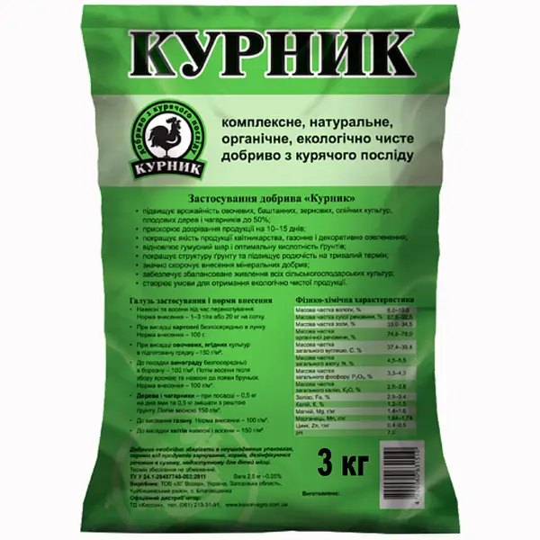 Курник – це органічне добриво на основі курячого посліду. Використовується на всіх ґрунтах і в будь-яких кліматичних зонах під усі види овочевих, ягідних та плодових культур. Ефективність застосування добрива є набагато вищою, ніж застосування компосту чи перегною. В процесі виробництва добрива відбувається процес фіксації азоту шляхом його перетворення на органічну форму. Це дозволяє рослинам засвоювати його і не відчувати шкоди для кореневої системи (звичайний свіжий курячий послід може обпалювати кореневі волоски). Технологія виробництва передбачає знезараження від шкідливих бактерій, яєць гельмінтів, насіння бур’янів. За вмістом азоту, фосфору і калію Курник® належить до органічних добрив і високим вмістом поживних елементів, що дає можливість значно скоротити внесення мінеральних добрив. Ця властивість робить його цінним при вирощуванні екологічно чистої продукції.