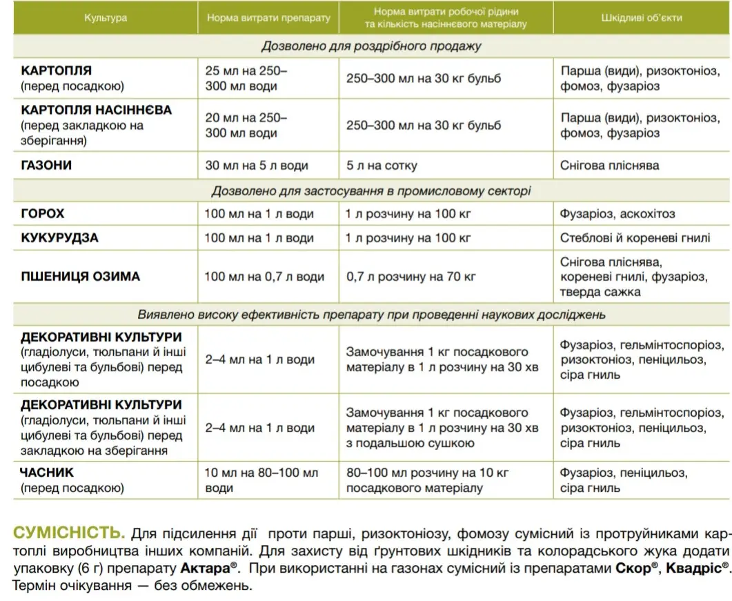 – Картопля (перед посадкою та на зберігання): 7,5 мл/80-100 мл води на 10 кг бульб. Парша (види), фузаріоз, ризоктоніоз, фомоз.