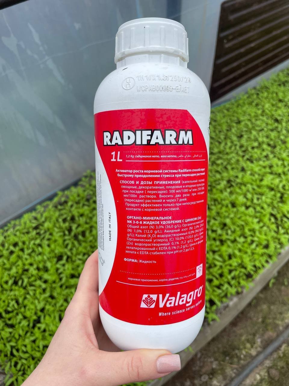 Radifarm –потужний біостимулятор росту, застосовується після висадки або пересадки всіх видів рослин для укорінення, відновлює корінь після пошкоджень (шкідниками), у тому числі в тяжких випадках. Також підходить для замочування розсади, насіння, підживлення живців. Виводить рослини із стану ступору, чудово оновлює опісля збору врожаю, стимулює вироблення гормонів, що робить рослини більш стійкими до температурних перепадів.