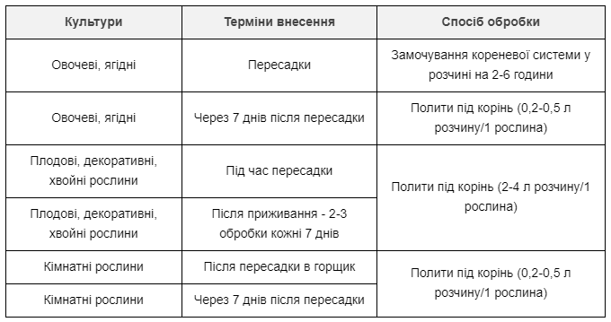 – зменшує стрес, викликаний пересаджуванням (висаджуванням) рослин та сприяє швидкому укоріненню розсади, саджанців та квітів;