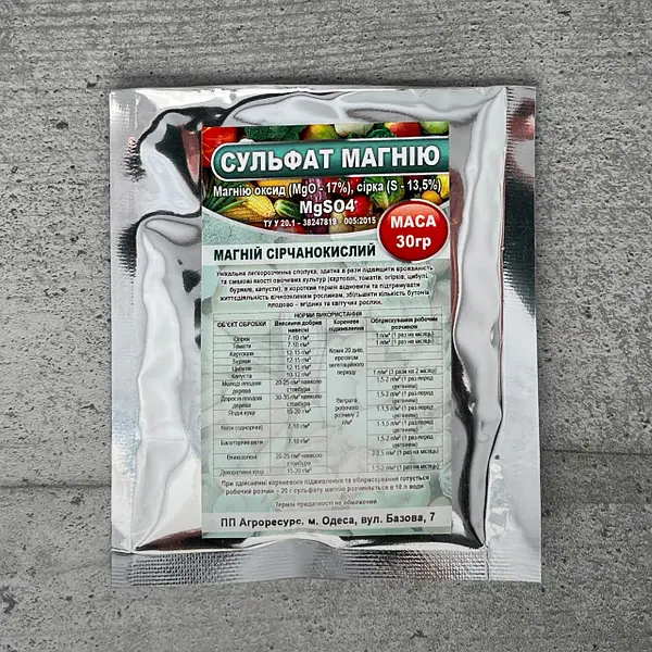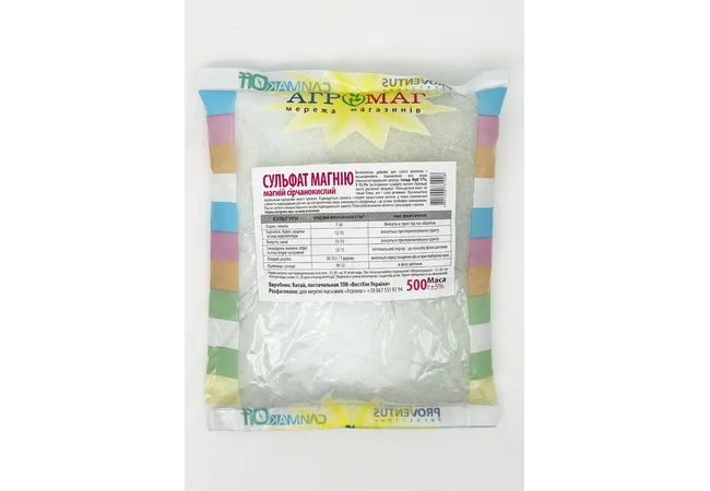 Добриво Сульфат магнію — це ефективне джерело магнію, який є ключовим мінералом для багатьох біологічних процесів у рослинах. СІрчанокислий магній відноситься до унікальної, легкорозчинної сполуки, яка здатна в рази підвищити врожайність та смакові якості овочевих культур (картоплі, томатів, огірків, цибулі, буряків, капусти); в короткий термін відновити та підтримувати життєдіяльність вічнозеленим рослинам, збільшити кількість бутонів плодово-ягідних та квітучих рослин. Магнію оксид складається: (MgO) – 17%, сірка (S) – 13,5%.